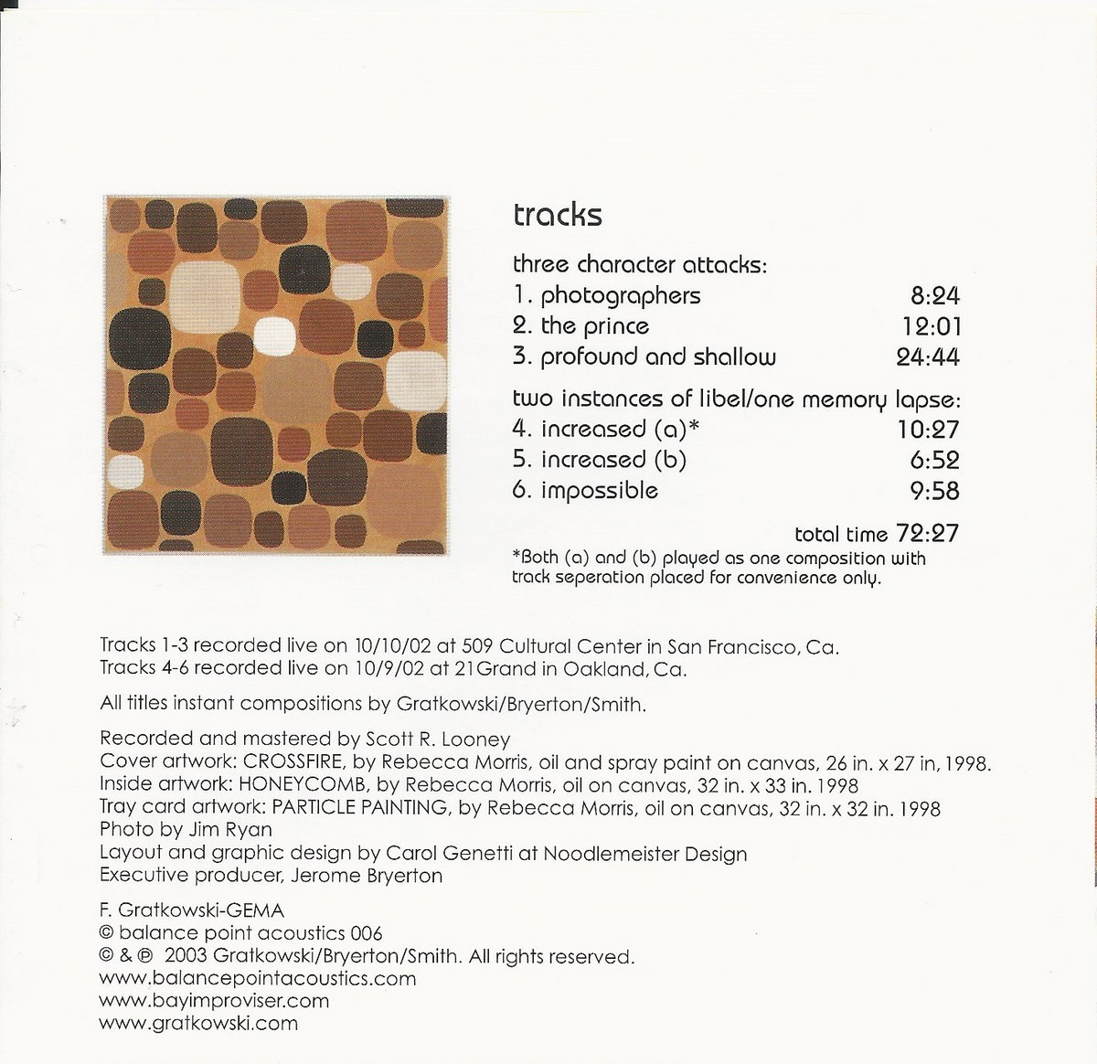 Tracks 1-3 recorded on 10 October 2002 at 509 Cultural Center, San Francisco, California; tracks 4-6 were recorded on 9 October 2002 at 21Grand, Oakland, California.