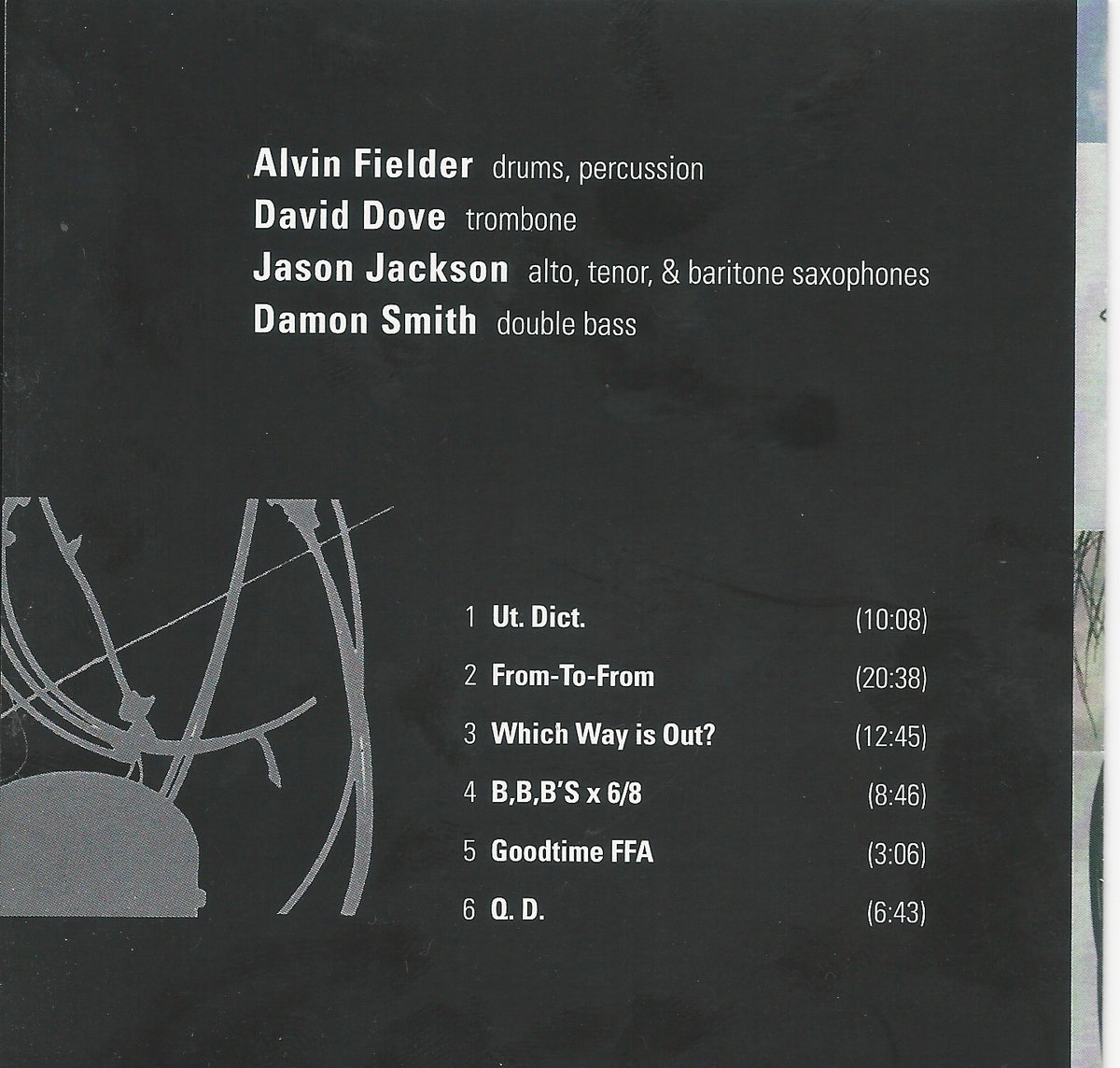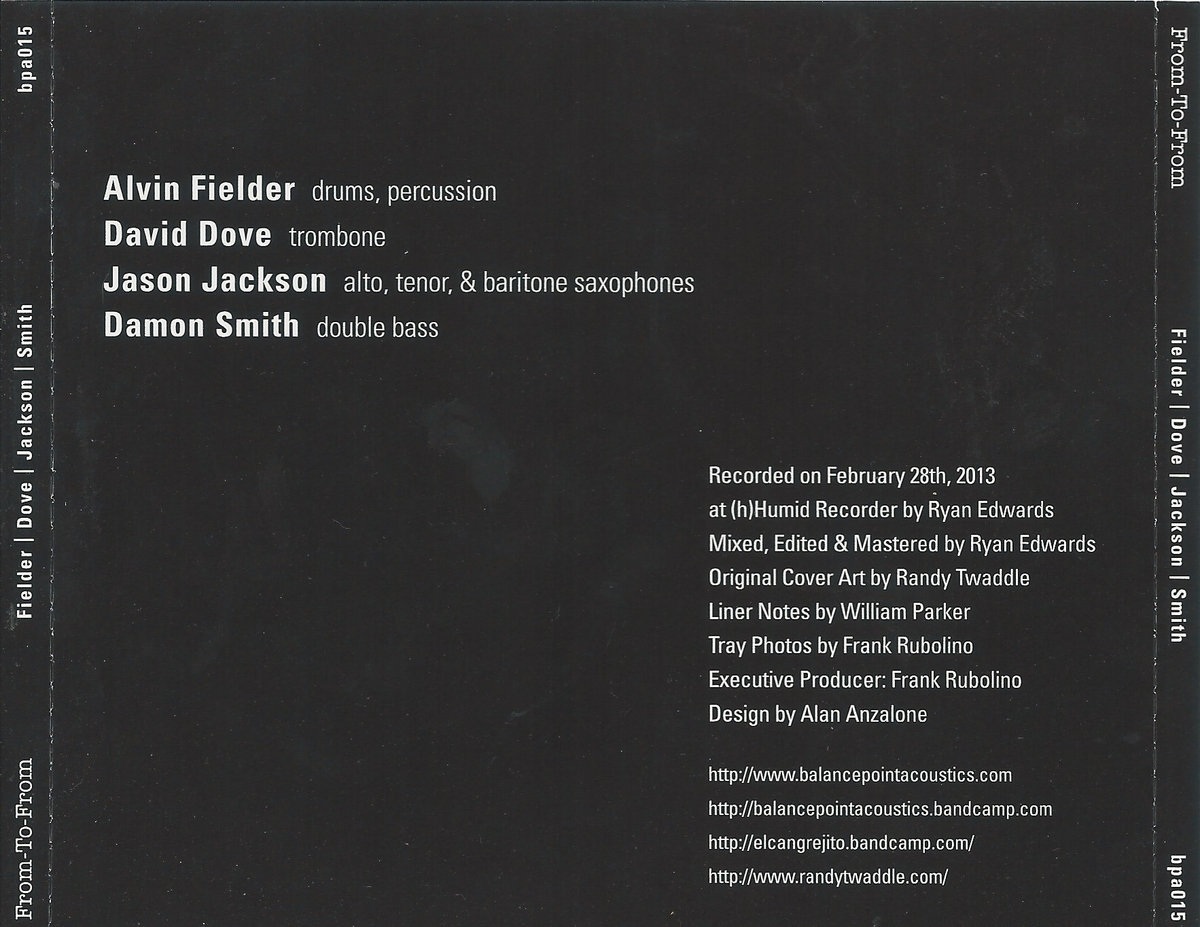 From-To-From presents a one-of-a-kind meeting of generations and geography. On the face of things, it might seem like a Southern free music super-group and that would be enough to whet the appetite – septuagenarian drummer Alvin Fielder hails from Jackson, Mississippi and trombonist Dave Dove, saxophonist Jason Jackson and bassist Damon Smith from Houston, a recognized hotbed of art and creative music in a state whose political and cultural struggles are by now all too familiar. Fielder (b. 1935) is an institution in and of himself; a student and historian of modern jazz drumming, he was a member of the AACM in Chicago in the late 1960s before returning to his home state in 1969. Since that time he’s co-led the Improvisational Arts Quartet (with saxophonist Kidd Jordan, trumpeter Clyde Kerr, Jr. and bassist London Branch), the Creative Collective (with Jordan, pianist/saxophonist Joel Futterman and bassist William Parker), and worked extensively with Dallas trumpeter Dennis González, Memphis pianist Chris Parker, saxophonists Ike Levin, Andrew Lamb and Mats Gustafsson, and many others.