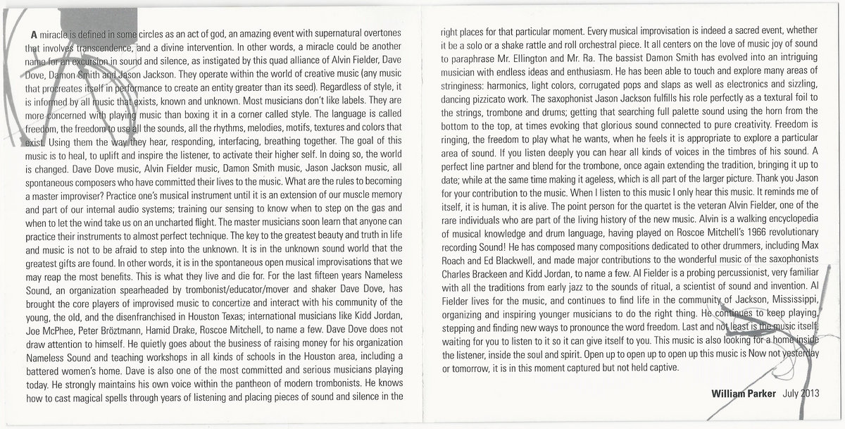 A miracle is defined in some circles as an act of god, an amazing event with supernatural overtones that involves transcendence, and a divine intervention. In other words, a miracle could be another name for an excursion in sound and silence, as instigated by this quad alliance of Alvin Fielder, Dave Dove, Damon Smith and Jason Jackson. They operate within the world of creative music (any music that procreates itself in performance to create an entity greater than its seed). Regardless of style, it is informed by all music that exists, known and unknown. Most musicians don’t like labels. They are more concerned with playing music than boxing it in a corner called style. The language is called freedom, the freedom to use all the sounds, all the rhythms, melodies, motifs, textures and colors that exist. Using them the way they hear, responding, interfacing, breathing together. The goal of this music is to heal, to uplift and inspire the listener, to activate their higher self. In doing so, the world is changed. Dave Dove music, Alvin Fielder music, Damon Smith music, Jason Jackson music, all spontaneous composers who have committed their lives to the music. What are the rules to becoming a master improviser? Practice one’s musical instrument until it is an extension of our muscle memory and part of our internal audio systems; training our sensing to know when to step on the gas and when to let the wind take us on an uncharted flight. The master musicians soon learn that anyone can practice their instruments to almost perfect technique. The key to the greatest beauty and truth in life and music is not to be afraid to step into the unknown. It is in the unknown sound world that the greatest gifts are found. In other words, it is in the spontaneous open musical improvisations that we may reap the most benefits. This is what they live and die for. For the last fifteen years Nameless Sound, an organization spearheaded by trombonist/educator/mover and shaker Dave Dove, has brought the core players of improvised music to concertize and interact with his community of the young, the old, and the disenfranchised in Houston Texas; international musicians like Kidd Jordan, Joe McPhee, Peter Bröztmann, Hamid Drake, Roscoe Mitchell, to name a few. Dave Dove does not draw attention to himself. He quietly goes about the business of raising money for his organization Nameless Sound and teaching workshops in all kinds of schools in the Houston area, including a battered women’s home. Dave is also one of the most committed and serious musicians playing today. He strongly maintains his own voice within the pantheon of modern trombonists. He knows how to cast magical spells through years of listening and placing pieces of sound and silence in the right places for that particular moment. Every musical improvisation is indeed a sacred event, whether it be a solo or a shake rattle and roll orchestral piece. It all centers on the love of music joy of sound to paraphrase Mr. Ellington and Mr. Ra. The bassist Damon Smith has evolved into an intriguing musician with endless ideas and enthusiasm. He has been able to touch and explore many areas of stringiness: harmonics, light colors, corrugated pops and slaps as well as electronics and sizzling, dancing pizzicato work. The saxophonist Jason Jackson fulfills his role perfectly as a textural foil to the strings, trombone and drums; getting that searching full palette sound using the horn from the bottom to the top, at times evoking that glorious sound connected to pure creativity. Freedom is ringing, the freedom to play what he wants, when he feels it is appropriate to explore a particular area of sound. If you listen deeply you can hear all kinds of voices in the timbres of his sound. A perfect line partner and blend for the trombone, once again extending the tradition, bringing it up to date; while at the same time making it ageless, which is all part of the larger picture. Thank you Jason for your contribution to the music. When I listen to this music I only hear this music. It reminds me of itself, it is human, it is alive. The point person for the quartet is the veteran Alvin Fielder, one of the rare individuals who are part of the living history of the new music. Alvin is a walking encyclopedia of musical knowledge and drum language, having played on Roscoe Mitchell’s 1966 revolutionary recording Sound! He has composed many compositions dedicated to other drummers, including Max Roach and Ed Blackwell, and made major contributions to the wonderful music of the saxophonists Charles Brackeen and Kidd Jordan, to name a few. Al Fielder is a probing percussionist, very familiar with all the traditions from early jazz to the sounds of ritual, a scientist of sound and invention. Al Fielder lives for the music, and continues to find life in the community of Jackson, Mississippi, organizing and inspiring younger musicians to do the right thing. He continues to keep playing, stepping and finding new ways to pronounce the word freedom. Last and not least is the music itself, waiting for you to listen to it so it can give itself to you. This music is also looking for a home inside the listener, inside the soul and spirit. Open up to open up to open up this music is Now not yesterday or tomorrow, it is in this moment captured but not held captive.