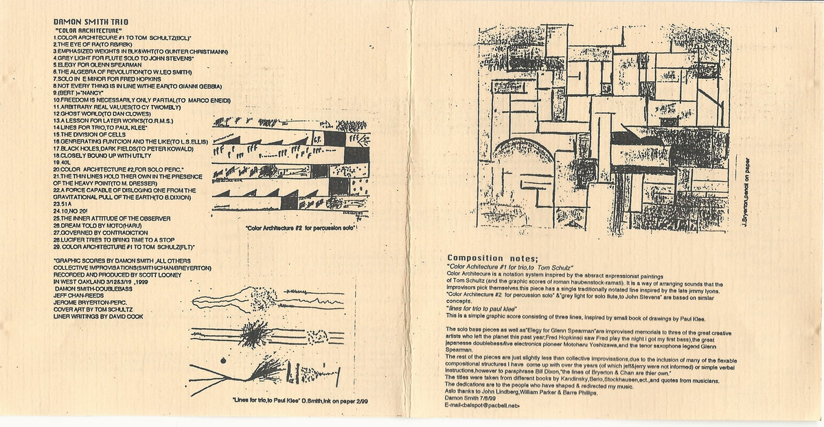 The rest of the pieces are just slightly less than collective improvisations, due to the inclusion of many of the flexible compositional structures I have come up with over the years (oc which Jeff and Jerry were not informed) or simple verbal instructions. However, to paraphrase Bill Dixon, “the line of Bryerton and Chan are their own.” The titles were taken from different books by Kandinsky, Berio, Stockhausen, etc., and quotes from musicians. The dedications are to people who have shaped and redirected my music. Also thanks to John Lindberg, William Parker, and Barre Phillips. Damon Smith 7/8/99